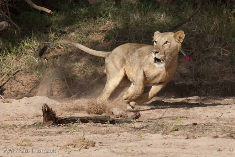 Seconds after Dr. Chege fired the dart perfectly into his shoulder, Lguret leaped up, wheeled around to see what stung him. You can see the pink plume from the end of the dart.